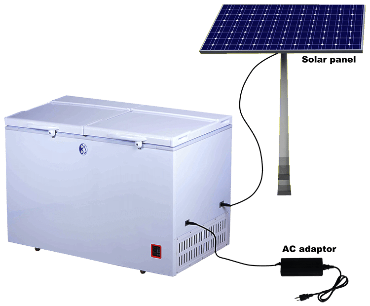 Usage: This method uses solar panels with a built-in lithium battery and Power Management Unit (PMU). The solar panels charge the built-in battery directly, eliminating the need for a separate controller or external battery charger. The freezer can also be powered and recharged via an AC/DC adapter, and external batteries can be added as needed for extended power.
